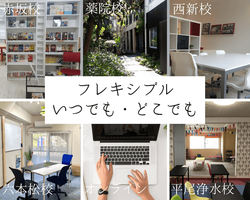 プライベートレッスンでは、西新校・赤坂校・薬院校・六本松校・平尾浄水校の他にも、オンラインでのレッスンも可能です。